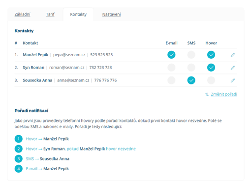 Poplach se oznámí formou hovoru, SMS nebo e-mailu